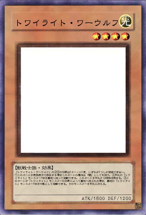 | 「トワイライト・ワーウルフ」の②③の効果は1ターンに1度、いずれか1つしか使用できない。①このカードが表側表示で存在する場合このカードの属性は「闇」としても扱う。②手札の「トワイライト」モンスター1体を墓地へ送って発動できる。このカードを手札から特殊召喚する。③このカードが「トワイライト」モンスターの効果によって墓地へ送られた場合、墓地の「トワイライト」モンスター1体を対象として発動できる。そのモンスターを手札に加える。 | |||