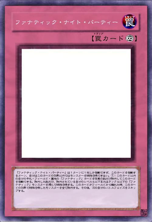 | 「ファナティック・ナイト・パーティー」は1ターンに1枚しか発動できず、このカードを発動するターン、自分はこのカードの効果以外ではモンスターを特殊召喚できない。①:このカード以外の自分の手札・フィールド・墓地の「ファナティック」カードを任意の数だけ除外してこのカードを発動できる。除外した数だけ、除外されている自分のレベル4以下またはランク4以下の「ファナティック」モンスターを選んで特殊召喚する。このカードがフィールドから離れた時、このカードの効果で特殊召喚したモンスターを全て除外する。その後、次の自分のバトルフェイズをスキップする。 | |||