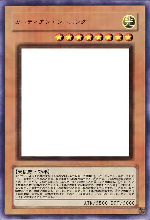 | 自分フィールド上に存在する「女神の聖剣-エアトス」を装備した「ガーディアン・エアトス」をリリースすることでのみこのカードを手札から特殊召喚できる。①このカードが特殊召喚に成功した時、デッキから「女神の光剣-シーニング」を1枚選択しこのカードに装備する。②1ターンに1度相手の墓地に存在するモンスター1体を選択して発動できる。選択したモンスターを除外し、エンドフェイズまでそのモンスターの攻撃力分このカードの攻撃力をアップする。③このカードが破壊された時、墓地に存在する「ガーディアン・エアトス」1体を特殊召喚する。さらに墓地に「女神の聖剣 エアトス」が存在する場合、そのカードを自分フィールド上の「ガーディアン・エアトス」に装備することができる。 | |||