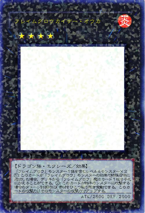 「フレイムグロウ」モンスター1体を含むレベル4モンスター×2 ①;このカードが「フレイムグロウ」モンスターの効果で特殊召喚に成功した場合、デッキから「フレイムグロウ」魔法カード1枚を手札に加えることができる。②;このカードが相手モンスターに攻撃する場合のダメージ計算時にX素材をひとつ取り除き発動できる。このカードの攻撃力はそのモンスターの攻撃力分アップする。 |