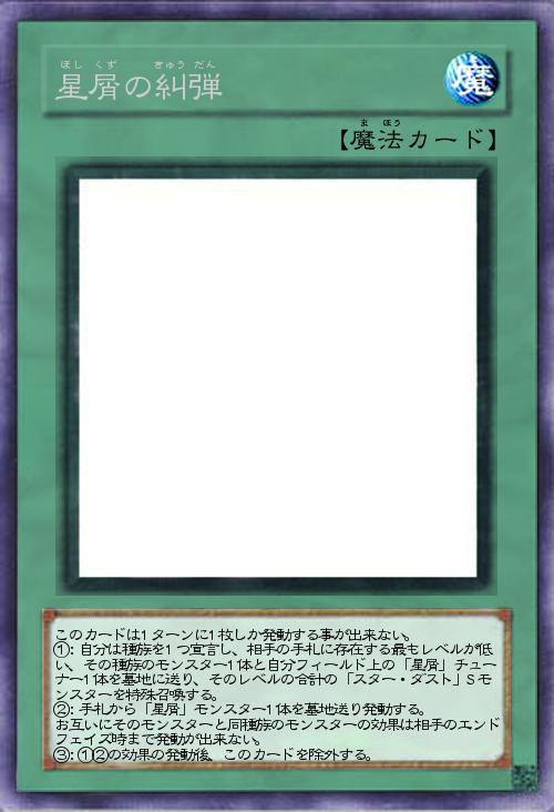 このカードは1ターンに1枚しか発動する事が出来ない。 ①:自分は種族を1つ宣言し、相手の手札に存在する最もレベルが低い、その種族のモンスター1体と自分フィールド上の「星屑」チューナー1体を墓地に送り、そのレベルの合計の「スター・ダスト」Sモンスターを特殊召喚する。 ②:手札から「星屑」モンスター1体を墓地送り発動する。 お互いにそのモンスターと同種族のモンスターの効果は相手のエンドフェイズ時まで発動が出来ない。 ③:①②の効果の発動後、このカードを除外する。 |