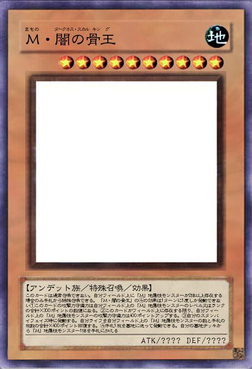 このカードは通常召喚できない。自分フィールド上に「M」地属性モンスターが2体以上存在する場合のみ手札から特殊召喚できる。「M・闇の骨王」の④の効果は1ターンに1度しか発動できない①このカードの攻撃力守備力は自分フィールド上の「M」地属性モンスターのレベル又はランクの合計×300ポイントの数値になる。②このカードがフィールド上に存在する限り、自分フィールド上の「M」地属性モンスターの攻撃力守備力は400ポイントアップする。③自分のスタンバイフェイズ時に発動する。自分ライフを自分フィールド上の「M」地属性モンスターの数と手札の枚数の合計×400ポイント回復する。④手札1枚を墓地に送って発動できる。自分の墓地デッキから「M」地属性モンスター1体を手札に加える |