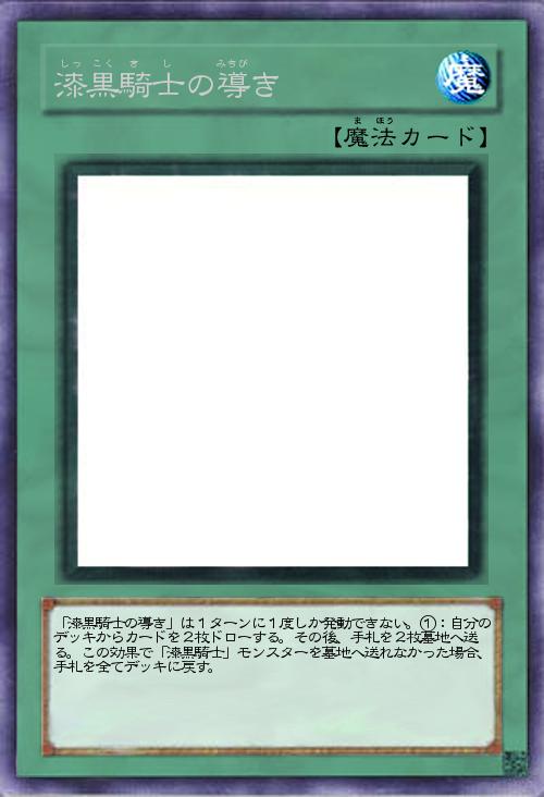 | 「漆黒騎士の導き」は1ターンに1度しか発動できない。①:自分のデッキからカードを2枚ドローする。その後、手札を2枚墓地へ送 る。この効果で「漆黒騎士」モンスターを墓地へ送れなかった場合、手札を全てデッキに戻す。 | |||
