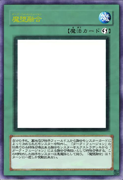 | 自分の手札、墓地及び相手フィールド上から融合モンスターカードによって決められたモンスターを除外し、「ダーク・フュージョン」の効果でのみ特殊召喚出来る融合モンスターをエクストラデッキから「ダーク・フュージョン」による融合召喚扱いとして特殊召喚する。この時除外した相手モンスターは悪魔族として扱う。「魔堕融合」は1ターンに一度しか発動出来ない。 | |||
