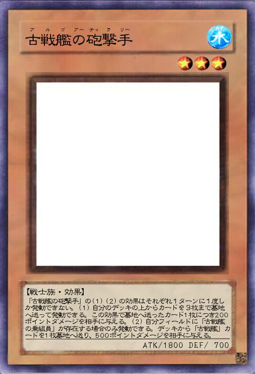 「古戦艦の砲撃手」の(1)(2)の効果はそれぞれ1ターンに1度しか発動できない。(1)自分のデッキの上からカードを3枚まで墓地へ送って発動できる。この効果で墓地へ送ったカード1枚につき200ポイントダメージを相手に与える。(2)自分フィールドに「古戦艦の乗組員」が存在する場合のみ発動できる。デッキから「古戦艦」カードを1枚墓地へ送り、500ポイントダメージを相手に与える。 |