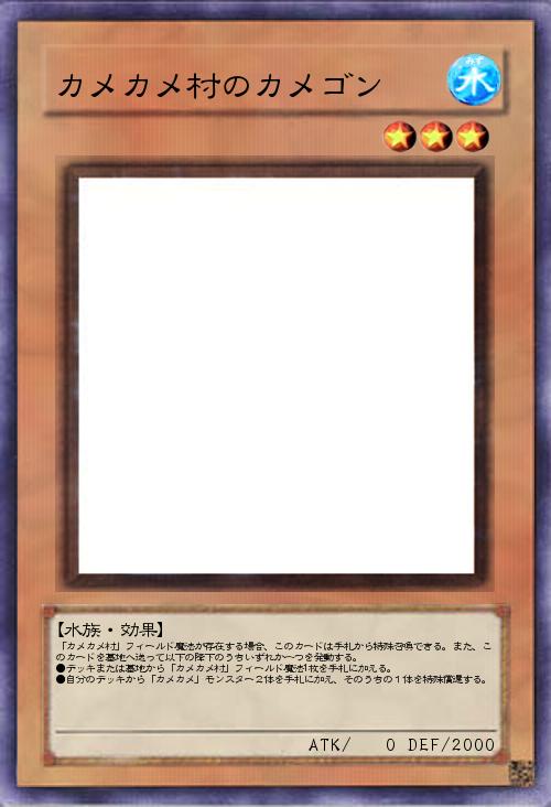 「カメカメ村」フィールド魔法が存在する場合、このカードは手札から特殊召喚できる。また、このカードを墓地へ送って以下の降下のうちいずれか一つを発動する。 ●デッキまたは墓地から「カメカメ村」フィールド魔法1枚を手札に加える。 ●自分のデッキから「カメカメ」モンスター2体を手札に加え、そのうちの1体を特殊償還する。 |