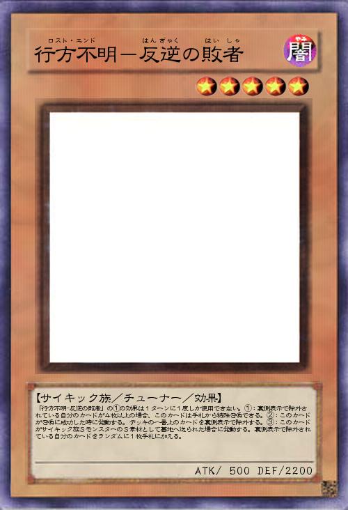 | 「行方不明-反逆の敗者」の①の効果は1ターンに1度しか使用できない。①:裏側表示で除外されている自分のカードが4枚以上の場合、このカードは手札から特殊召喚できる。②:このカードが召喚に成功した時に発動する。デッキの一番上のカードを裏側表示で除外する。③:このカードがサイキック族SモンスターのS素材として墓地へ送られた場合に発動する。裏側表示で除外されている自分のカードをランダムに1枚手札に加える。 | |||