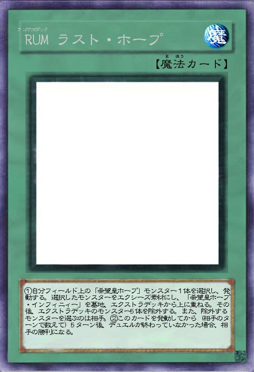 | ①自分フィールド上の「希望皇ホープ」モンスター1体を選択し、発動する。選択したモンスターをエクシーズ素材にし、「希望皇ホープ・インフィニィー」を墓地、エクストラデッキから上に重ねる。その後、エクストラデッキのモンスター5体を除外する。また、除外するモンスターを選ぶのは相手。②このカードを発動してから(相手のターンで数えて)5ターン後、デュエルが終わっていなかった場合、相手の勝利になる。 | |||