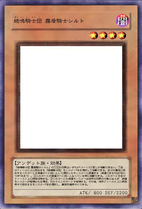 | 「絶鳴騎士団 霧盾騎士シルト」の①②の効果はいずれか1ターンに1度しか発動できない。①自分フィールド上に存在する「絶鳴騎士団」モンスター1体を選択して発動できる。自分の墓地に存在するこのカードを装備カード扱いとして選択したモンスターに装備する(装備できるのは1体につき1枚まで)。②このカードが装備カード扱いとなっている時に発動できる。このカードを自分フィールド上に特殊召喚する。③このカードの装備モンスターは相手の効果の対象にならず、装備モンスターが破壊される場合、代わりにこのカードを破壊する。その後、相手フィールド上に表側表示で存在するモンスター1体を選択し、裏側守備表示にできる。 | |||