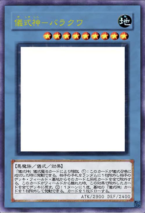 | 「儀式神」儀式魔法カードにより降臨。①:このカードが儀式召喚に成功した時に発動できる。相手の手札をランダムに1枚除外し相手のデッキ・フィールド・墓地からそのカードと同名カードを全て除外する。このカードがフィールドから離れた時、この効果で除外したカードを全てデッキに戻す。②:1ターンに1度、墓地の「儀式神」カードを1枚除外して発動できる。カードを1枚ドローする。 | |||