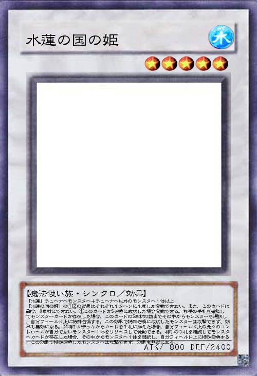 「水蓮」チューナーモンスター+チューナー以外のモンスター1体以上 「水蓮の国の姫」の①②の効果はそれぞれ1ターンに1度しか発動できない。また、このカードは融合、X素材にできない。①このカードがS召喚に成功した場合発動できる。相手の手札を確認してモンスターカードが存在した場合、このカードのS素材の数までその中からモンスターを選択し、自分フィールド上に特殊召喚する。この効果で特殊召喚に成功したモンスターは攻撃できず、効果も無効になる。②相手がデッキからカードを手札に加えた場合、自分フィールド上の元々のコントロールが自分でないモンスター1体をリリースして発動できる。相手の手札を確認してモンスターカードが存在した場合、その中からモンスター1体を選択し、自分フィールド上に特殊召喚する。この効果で特殊召喚したモンスターは攻撃できず、効果も無効になる。 |