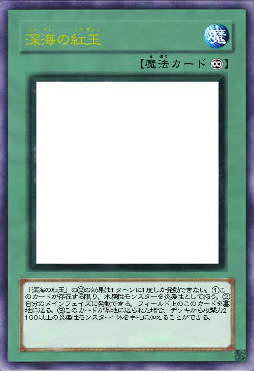 | 「深海の紅玉」の②の効果は1ターンに1度しか発動できない。①このカードが存在する限り、水属性モンスターを炎属性として扱う。②自分のメインフェイズに発動できる。フィールド上のこのカードを墓地に送る。③このカードが墓地に送られた場合、デッキから攻撃力2100以上の炎属性モンスター1体を手札に加えることができる。 | |||