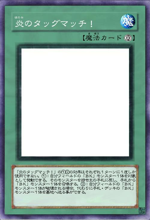 | 「炎のタッグマッチ!」の①②の効果はそれぞれ1ターンに1度しか使用できない。①:自分フィールドの「BK」モンスター1体を対象として発動できる。そのモンスターを持ち主の手札に戻し、手札から「BK」モンスター1体を召喚する。②:自分フィールドの「BK」モンスター1体が破壊される場合、代わりに手札・デッキの「BK」モンスター1体を墓地へ送る事ができる。 | |||