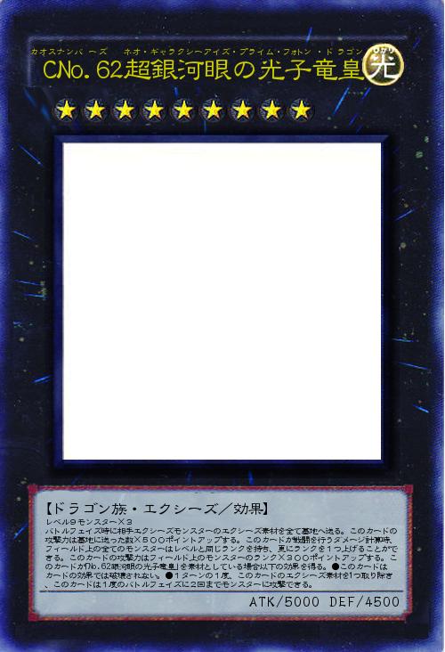 レベル9モンスター×3 バトルフェイズ時に相手エクシーズモンスターのエクシーズ素材を全て墓地へ送る。このカードの攻撃力は墓地に送った数×500ポイントアップする。このカードが戦闘を行うダメージ計算時、フィールド上の全てのモンスターはレベルと同じランクを持ち、更にランクを1つ上げることができる。このカードの攻撃力はフィールド上のモンスターのランク×300ポイントアップする。このカードが「No.62銀河眼の光子竜皇」を素材としている場合以下の効果を得る。●このカードはカードの効果では破壊されない。●1ターンの1度、このカードのエクシーズ素材を1つ取り除き、このカードは1度のバトルフェイズに2回までモンスターに攻撃できる。 |