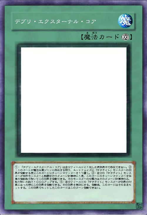 | ①:「デブリ・エクスターナル・コア」は自分フィールドに1枚しか表側表示で存在できない。②:このカードが魔法&罠ゾーンに存在する限り、エンドフェイズに「サテライト」モンスターの効果が発動する度にこのカードにチャージカウンターを1つ置く。③:自分の「サテライト」モンスターが相手モンスターと戦闘を行うダメージ計算時に1度、このカードのチャージカウンターを任意の個数取り除いてこの効果を発動できる。そのモンスターの攻撃力はそのダメージ計算時のみ、取り除いた数×1000アップする。④:自分フィールドの「サテライト」モンスターが効果の対象になった時にこの効果を発動できる。その効果を無効にする。発動後、このカードはそのままセットする。この効果でセットしたこのカードはこのターン発動できない。 | |||