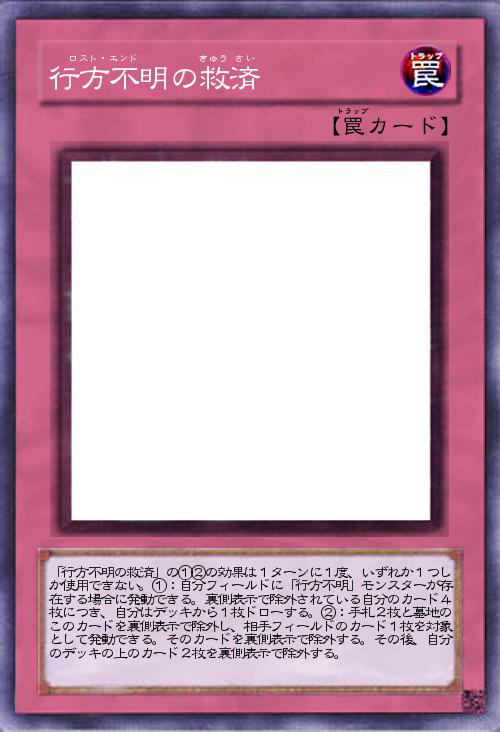 | 「行方不明の救済」の①②の効果は1ターンに1度、いずれか1つしか使用できない。①:自分フィールドに「行方不明」モンスターが存在する場合に発動できる。裏側表示で除外されている自分のカード4枚につき、自分はデッキから1枚ドローする。②:手札2枚と墓地のこのカードを裏側表示で除外し、相手フィールドのカード1枚を対象として発動できる。そのカードを裏側表示で除外する。その後、自分のデッキの上のカード2枚を裏側表示で除外する。 | |||