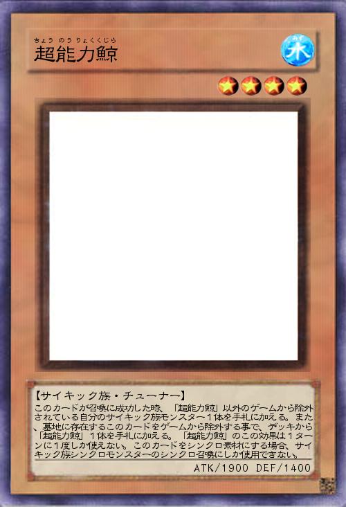 | このカードが召喚に成功した時、「超能力鯨」以外のゲームから除外されている自分のサイキック族モンスター1体を手札に加える。また、墓地に存在するこのカードをゲームから除外する事で、デッキから「超能力鯨」1体を手札に加える。「超能力鯨」のこの効果は1ターンに1度しか使えない。このカードをシンクロ素材にする場合、サイキック族シンクロモンスターのシンクロ召喚にしか使用できない。 | |||