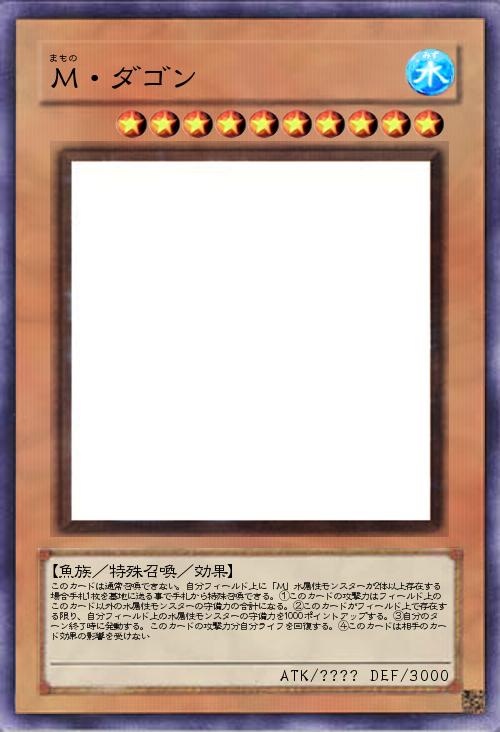 | このカードは通常召喚できない。自分フィールド上に「M」水属性モンスターが2体以上存在する場合手札1枚を墓地に送る事で手札から特殊召喚できる。①このカードの攻撃力はフィールド上のこのカード以外の水属性モンスターの守備力の合計になる。②このカードがフィールド上で存在する限り、自分フィールド上の水属性モンスターの守備力を1000ポイントアップする。③自分のターン終了時に発動する。このカードの攻撃力分自分ライフを回復する。④このカードは相手のカード効果の影響を受けない | |||
