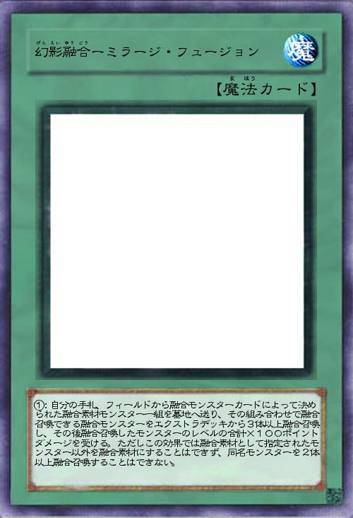 | ①:自分の手札、フィールドから融合モンスターカードによって決められた融合素材モンスター一組を墓地へ送り、その組み合わせで融合召喚できる融合モンスターをエクストラデッキから3体以上融合召喚し、その後融合召喚したモンスターのレベルの合計×100ポイントダメージを受ける。ただしこの効果では融合素材として指定されたモンスター以外を融合素材にすることはできず、同名モンスターを2体以上融合召喚することはできない。 | |||