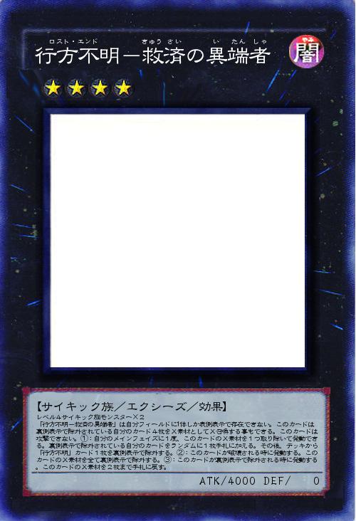 | レベル4サイキック族モンスター×2 「行方不明-救済の異端者」は自分フィールドに1体しか表側表示で存在できない。このカードは裏側表示で除外されている自分のカード4枚をX素材としてX召喚する事もできる。このカードは攻撃できない。①:自分のメインフェイズに1度、このカードのX素材を1つ取り除いて発動できる。裏側表示で除外されている自分のカードをランダムに1枚手札に加える。その後、デッキから「行方不明」カード1枚を裏側表示で除外する。②:このカードが破壊される時に発動する。このカードのX素材を全て裏側表示で除外する。③:このカードが裏側表示で除外される時に発動する。このカードのX素材を2枚まで手札に戻す。 | |||