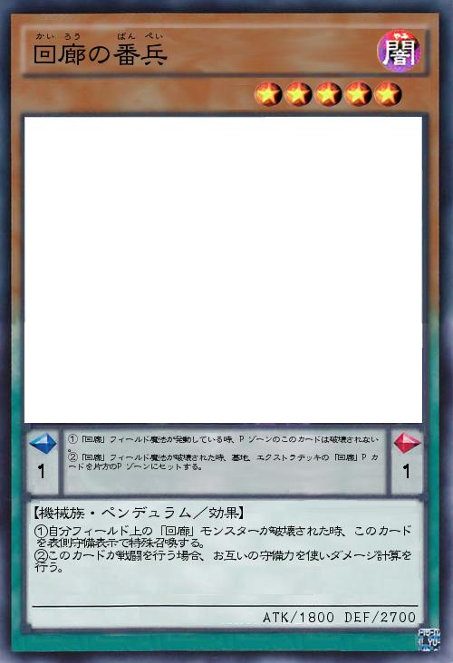 | ①「回廊」フィールド魔法が発動している時、Pゾーンのこのカードは破壊されない。 ②「回廊」フィールド魔法が破壊された時、墓地、エクストラデッキの「回廊」Pカードを片方のPゾーンにセットする。 | |||