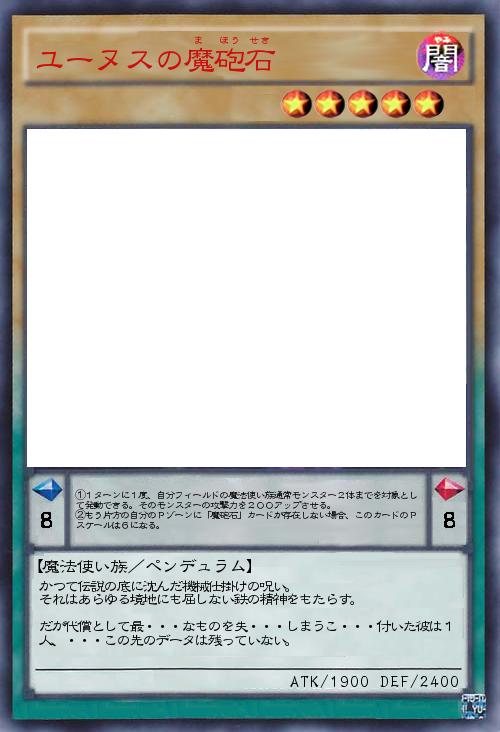 | ①1ターンに1度、自分フィールドの魔法使い族通常モンスター2体までを対象として発動できる。そのモンスターの攻撃力を200アップさせる。 ②もう片方の自分のPゾーンに「魔砲石」カードが存在しない場合、このカードのPスケールは6になる。 | |||