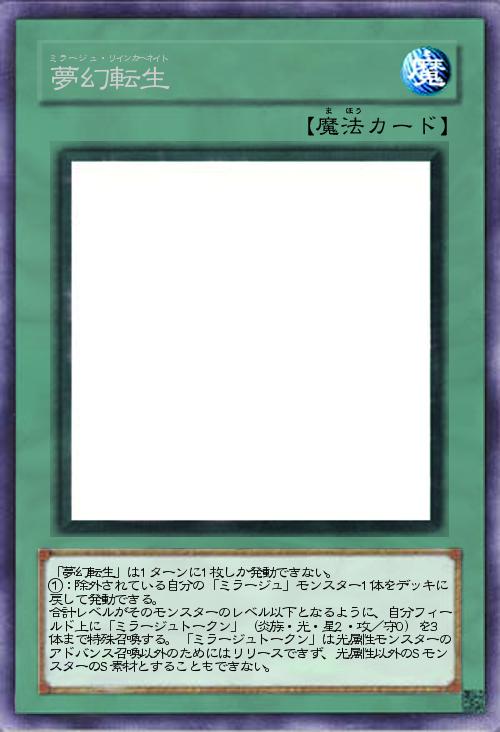 | 「夢幻転生」は1ターンに1枚しか発動できない。 ①:除外されている自分の「ミラージュ」モンスター1体をデッキに戻して発動できる。 合計レベルがそのモンスターのレベル以下となるように、自分フィールド上に「ミラージュトークン」(炎族・光・星2・攻/守0)を3体まで特殊召喚する。「ミラージュトークン」は光属性モンスターのアドバンス召喚以外のためにはリリースできず、光属性以外のSモンスターのS素材とすることもできない。 | |||