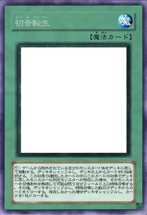 | ①:ゲームから除外されている自分のモンスター1体をデッキに戻して発動する。デッキをシャッフルし、デッキの上からカードを5枚確認する。この効果で確認したカードの中にこのカードの効果でデッキに戻したモンスターの同名モンスターが存在した場合、そのモンスターを召喚条件を無視して可能な限り自分フィールド上に特殊召喚する。その後、デッキをシャッフルし、特殊召喚した数だけデッキからカードをドローする。存在しなかった場合デッキをシャッフルし、カードを1枚ドローする。 | |||