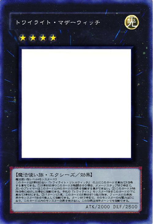 | 魔法使い族レベル4モンスター×3 このカードはX素材のない「トワイライト・リトルウィッチ」 の上にこのカードを重ねてX召喚する事もできる。①:X素材を持つこのカードが戦闘を行う場合、ダメージステップ終了時まで、互いのプレイヤーはこのカード以外のカードの効果を発動する事ができない。②:このカードが特殊召喚に成功した場合に発動できる。手札の「トワイライト」モンスター1体をこのカードの下に重ねてX素材にする。③:1ターンに1度、このカードのX素材を1つ取り除き、フィールドの表側表示モンスター1体を対象として発動できる。ターン終了時まで、そのモンスターの攻撃力は0になり、このカード以外のモンスター効果を受けない。この効果は相手ターンでも発動できる。 | |||