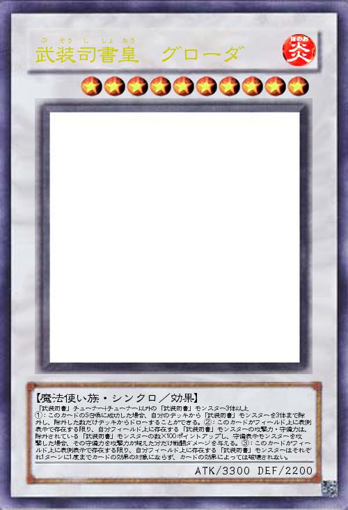 | 「武装司書」チューナー+チューナー以外の「武装司書」モンスター3体以上 ①:このカードのS召喚に成功した場合、自分のデッキから「武装司書」モンスターを3体まで除外し、除外した数だけデッキからドローすることができる。②:このカードがフィールド上に表側表示で存在する限り、自分フィールド上に存在する「武装司書」モンスターの攻撃力・守備力は、除外されている「武装司書」モンスターの数×100ポイントアップし、守備表示モンスターを攻撃した場合、その守備力を攻撃力が超えた分だけ戦闘ダメージを与える。③:このカードがフィールド上に表側表示で存在する限り、自分フィールド上に存在する「武装司書」モンスターはそれぞれ1ターンに1度までカードの効果の対象にならず、カードの効果によっては破壊されない。 | |||