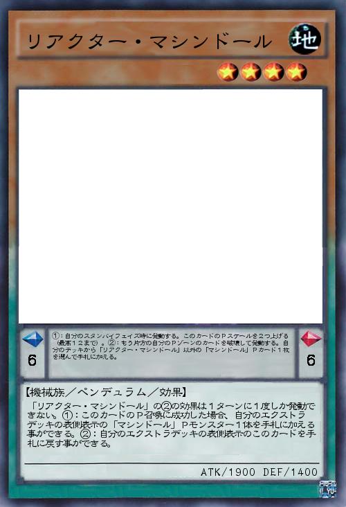| 「リアクター・マシンドール」の②の効果は1ターンに1度しか発動できない。①:このカードのP召喚に成功した場合、自分のエクストラ デッキの表側表示の「マシンドール」Pモンスター1体を手札に加える事ができる。②:自分のエクストラデッキの表側表示のこのカードを手札に戻す事ができる。 | |||
