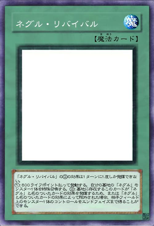 | 「ネグル・リバイバル」の②の効果は1ターンに1度しか発揮できない。 ①:800ライフポイント払って発動する。自分の墓地の「ネグル」モンスター1体を特殊召喚する。②:墓地に存在するこのカードが「ネグル」と名のついたカードの効果を発揮するため、または「ネグル」と名のついたカードの効果によって除外された場合、相手フィールド上のモンスター1体のコントロールをエンドフェイズまで得ることができる。 | |||