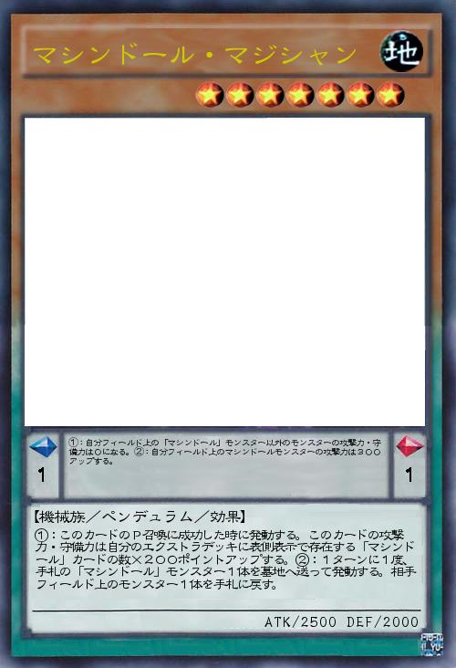 | ①:このカードのP召喚に成功した時に発動する。このカードの攻撃 力・守備力は自分のエクストラデッキに表側表示で存在する「マシンドール」カードの数×200ポイントアップする。②:1ターンに1度、手札の「マシンドール」モンスター1体を墓地へ送って発動する。相手フィールド上のモンスター1体を手札に戻す。 | |||