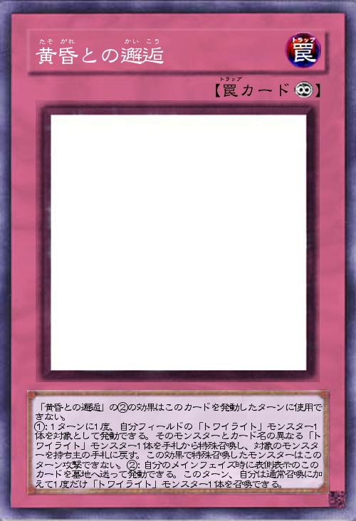 | 「黄昏との邂逅」の②の効果はこのカードを発動したターンに使用できない。 ①:1ターンに1度、自分フィールドの「トワイライト」モンスター1体を対象として発動できる。そのモンスターとカード名の異なる「トワイライト」モンスター1体を手札から特殊召喚し、対象のモンスターを持ち主の手札に戻す。この効果で特殊召喚したモンスターはこのターン攻撃できない。②:自分のメインフェイズ時に表側表示のこのカードを墓地へ送って発動できる。このターン、自分は通常召喚に加えて1度だけ「トワイライト」モンスター1体を召喚できる。 | |||