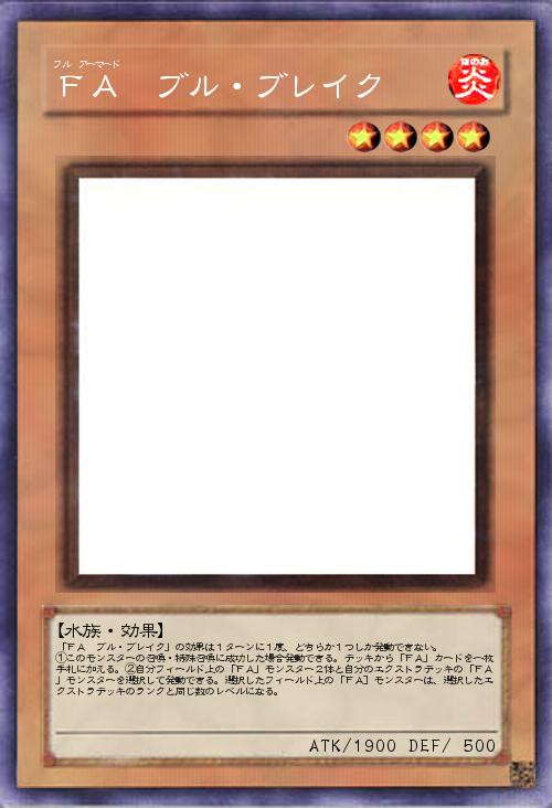 | 「FA ブル・ブレイク」の効果は1ターンに1度、どちらか1つしか発動できない。 ①このモンスターの召喚・特殊召喚に成功した場合発動できる。デッキから「FA」カードを一枚手札に加える。②自分フィールド上の「FA」モンスター2体と自分のエクストラデッキの「FA」モンスターを選択して発動できる。選択したフィールド上の「FA]モンスターは、選択したエクストラデッキのランクと同じ数のレベルになる。 | |||