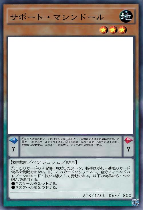 | ①:もう片方のPゾーンに「マシンドール」カードが存在する場合に発動できる。このカードのPスケールを1つ上げる。②:このカードのPスケールが10以上になった場合に発動する。このカードを破壊し、デッキから2枚ドローする。 | |||