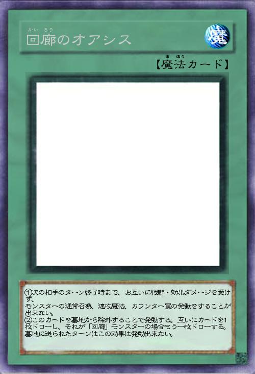 | ①次の相手のターン終了時まで、お互いに戦闘・効果ダメージを受けず、 モンスターの通常召喚、速攻魔法、カウンター罠の発動をすることが出来ない。 ②このカードを墓地から除外することで発動する。互いにカードを1枚ドローし、それが「回廊」モンスターの場合もう一枚ドローする。 墓地に送られたターンはこの効果は発動出来ない。 | |||