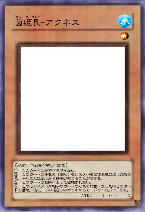| ①:このカードは通常召喚できない。 ②:このカードは手札の「菌姫」モンスターを2体墓地に送った時のみ、手札または墓地から特殊召喚することができる。 ③:このカードは戦闘によって破壊されない。 ④:このモンスターが相手のカードの効果の対象になった時このカードを墓地に送る。その後自分のデッキからカードを1枚ドローする。 | |||
