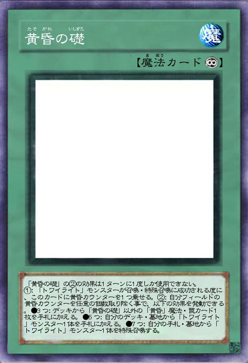 | 「黄昏の礎」の②の効果は1ターンに1度しか使用できない。 ①:「トワイライト」モンスターが召喚・特殊召喚に成功される度に、このカードに黄昏カウンターを1つ乗せる。②:自分フィールドの黄昏カウンターを任意の個数取り除く事で、以下の効果を発動できる。●3つ:デッキから「黄昏の礎」以外の「黄昏」魔法・罠カード1枚を手札に加える。●5つ:自分のデッキ・墓地から「トワイライト」モンスター1体を手札に加える。●7つ:自分の手札・墓地から「トワイライト」モンスター1体を特殊召喚する。 | |||