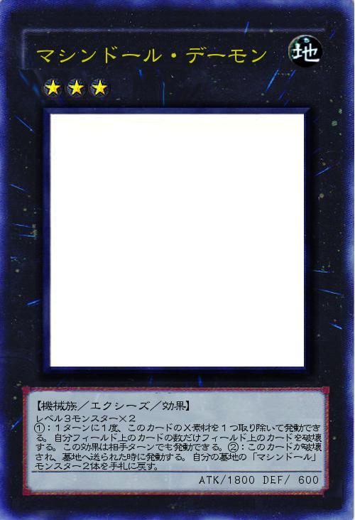 | レベル3モンスター×2 ①:1ターンに1度、このカードのX素材を1つ取り除いて発動できる。自分フィールド上のカードの数だけフィールド上のカードを破壊する。この効果は相手ターンでも発動できる。②:このカードが破壊され、墓地へ送られた時に発動する。自分の墓地の「マシンドール」モンスター2体を手札に戻す。 | |||