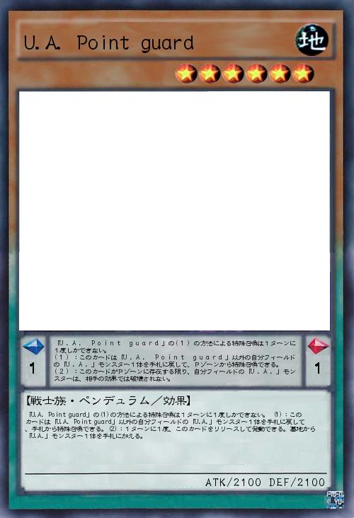 | 「U.A. Point guard」の(1)の方法による特殊召喚は1ターンに1度しかできない。 (1):このカードは「U.A. Point guard」以外の自分フィールドの「U.A.」モンスター1体を手札に戻して、Pゾーンから特殊召喚できる。 (2):このカードがPゾーンに存在する限り、自分フィールドの「U.A.」モンスターは、相手の効果では破壊されない。 | |||