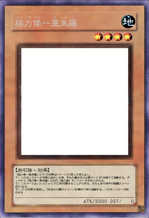 | 「揺力像ー亜朱羅」の(1)の効果は1ターンに1度しか使えない。 (1):このモンスターが召喚に成功した時、手札の魔法または罠カードを1枚捨てて発動する。デッキから「揺力像ー亜朱羅」以外の「揺力像」モンスターを手札に加える。 (2):このカードはバトルフェイズに3回攻撃することができる、そのときの相手の戦闘ダメージは0になる。 (3):(2)の効果を使用し、3回目の攻撃のダメージ計算終了時に発動する。このモンスターを除外する | |||