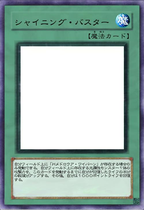 | 自分フィールド上に「Hメドロウア・ワイバーン」が存在する場合のみ発動できる。自分フィールド上に存在する光属性モンスター1体の攻撃力を、このカードを発動するまでに自分が回復したライフの半分の数値分アップする。その後、自分は1000ポイントライフを回復する。 | |||