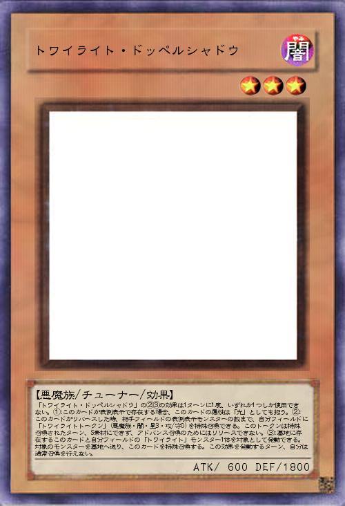 | 「トワイライト・ドッペルシャドウ」の②③の効果は1ターンに1度、いずれか1つしか使用できない。①:このカードが表側表示で存在する場合、このカードの属性は「光」としても扱う。②:このカードがリバースした時、相手フィールドの表側表示モンスターの数まで、自分フィールドに「トワイライトトークン」(悪魔族・闇・星3・攻/守0)を特殊召喚できる。このトークンは特殊召喚されたターン、S素材にできず、アドバンス召喚のためにはリリースできない。③:墓地に存在するこのカードと自分フィールドの「トワイライト」モンスター1体を対象として発動できる。対象のモンスターを墓地へ送り、このカードを特殊召喚する。この効果を発動するターン、自分は通常召喚を行えない。 | |||