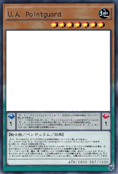 | 「U.A. Pointguard」の(1)の方法による特殊召喚は1ターンに1度しかできない。 (1):このカードは「U.A. Pointguard」以外の自分フィールドの「U.A.」モンスター1体を手札に戻して、Pゾーンから特殊召喚できる。 (2):このカードがPゾーンに存在する限り、自分フィールドの「U.A.」モンスターは、相手の効果では破壊されない。 | |||