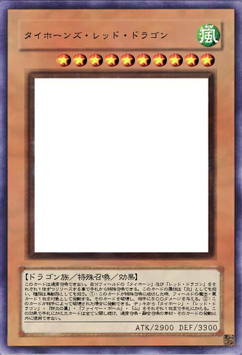 | このカードは通常召喚できない。自分フィールドの「タイホーン」及び「レッド・ドラゴン」をそれぞれ1体ずつリリースする事で手札から特殊召喚できる。このカードの属性は「炎」としても扱い、種族は鳥獣族としても扱う。①:このカードが特殊召喚に成功した時、フィールドの魔法・罠カード1枚を対象として発動する。そのカードを破壊し、相手に500ダメージを与える。②:このカードが相手によって破壊された場合に発動できる。デッキから「タイホーン」・「レッド・ドラゴン」・「邪炎の翼」・「ファイヤー・ボール」・「山」をそれぞれ1枚まで手札に加える。この効果で手札に加えたカードは全て公開し続け、通常召喚・融合召喚の素材・そのカードの発動以外に使用できない。 | |||