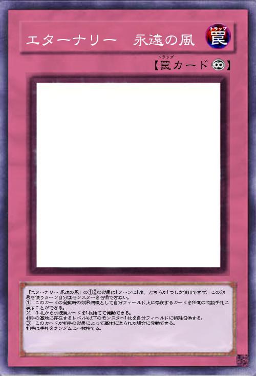 | 「エターナリー 永遠の風」の①②の効果は1ターンに1度、どちらか1つしか使用できず、この効果を使うターン自分はモンスターを召喚できない。 ① このカードの発動時の効果処理として自分フィールド上に存在するカードを任意の枚数手札に戻すことができる。 ② 手札から永続罠カードを1枚捨てて発動できる。 相手の墓地に存在するレベル4以下のモンスター1枚を自分フィールドに特殊召喚する。 ③ このカードが相手の効果によって墓地に送られた場合に発動できる。 相手は手札をランダムに一枚捨てる。 | |||