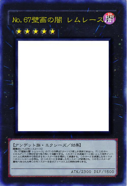 | 闇属性レベル5モンスター×2 「No.67壁画の闇 レムレース」の(1)の効果は1ターンに1度しか使用できない。(1)このカードのエクシーズ素材を全て取り除いて発動できる。このカードを装備カード扱いとして相手フィールド上に表側表示で存在するモンスター1体を選択して装備する。このカードを装備したモンスターのコントロールを得る。(2)このカードを装備したモンスターが破壊され、このモンスターが墓地へ送られた時このモンスターを自分フィールド上に特殊召喚できる。 | |||