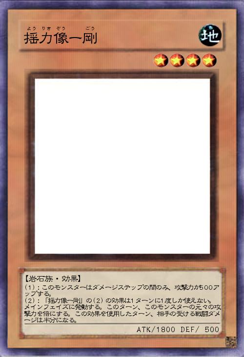 | (1):このモンスターはダメージステップの間のみ、攻撃力が500アップする。 (2):「揺力像ー剛」の(2)の効果は1ターンに1度しか使えない。メインフェイズに発動する。このターン、このモンスターの元々の攻撃力を倍にする。この効果を使用したターン、相手の受ける戦闘ダメージは半分になる。 | |||