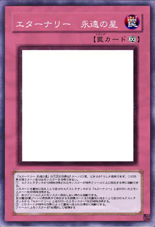 | 「エターナリー 永遠の星」の①②の効果は1ターンに1度、どちらか1つしか使用できず、この効果を使うターン自分はモンスターを召喚できない。 ① エクストラデッキから特殊召喚されたモンスターが相手フィールド上に存在する時に発動できる。 このカードを墓地に送ることで自分のエクストラデッキから「エターナリー」と名の付いたSモンスター一枚を特殊召喚する。 ② 自分フィールド上にモンスター存在しない時のみ発動できる。 自分魔法&罠ゾーンに表側表示で存在する永続罠カードを2枚墓地に送ることで自分のエクストラデッキから「エターナリー」と名の付いたSモンスター1枚を特殊召喚する。 ③ このカードが相手の効果によって墓地へ送られた場合に発動できる。 フィールド上モンスターを1枚選択して破壊する | |||